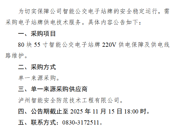 瀘州市公共交通集團(tuán)有限公司單一來源采購公告