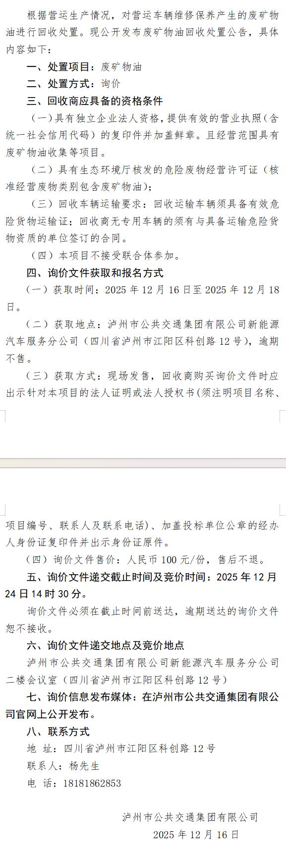 瀘州市公共交通集團有限公司廢礦物油回收處置公告
